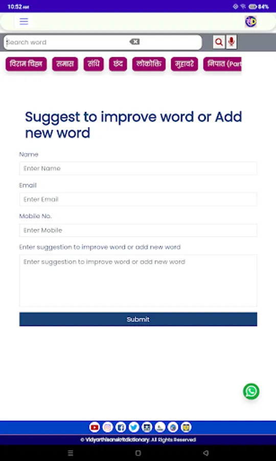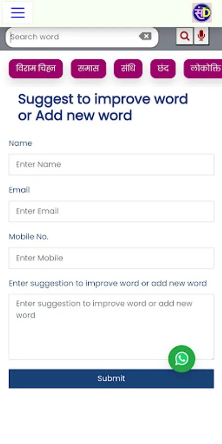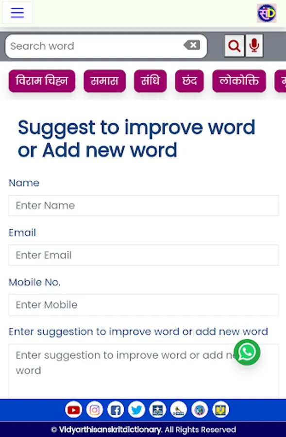 This is an invaluable treasure of language knowledge for the 'Vidyarthi Sanskrit dictionary' user. In this app, the user has been given the opportunity to know the translation by typing the word or sentence. Along with this, users can also send their own word and language suggestions to us, for this an option has been made available in the app.