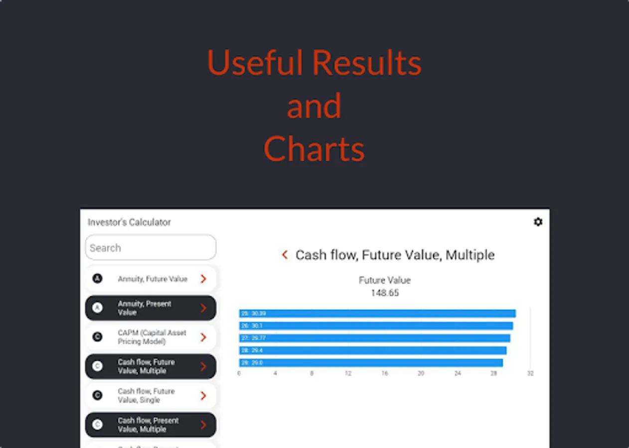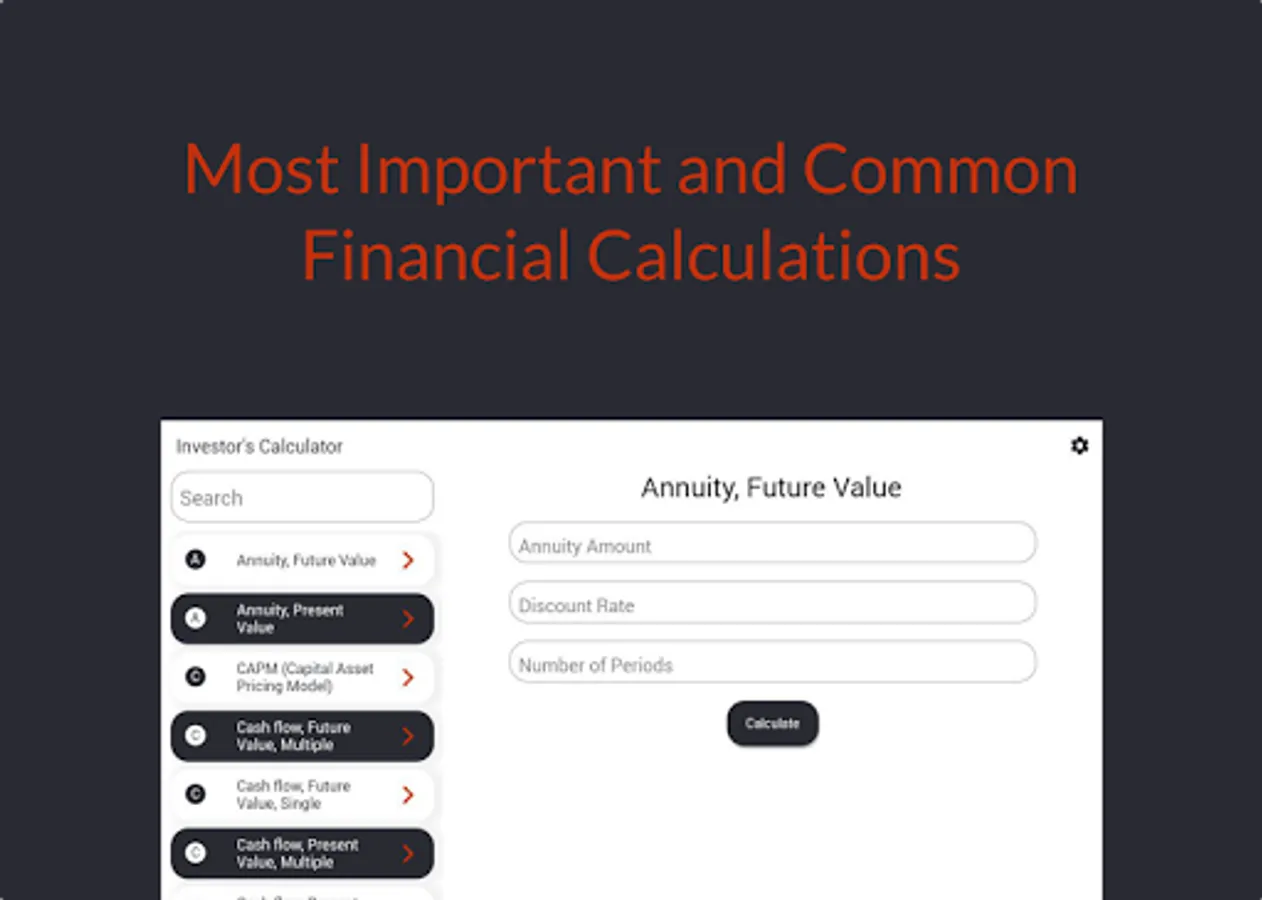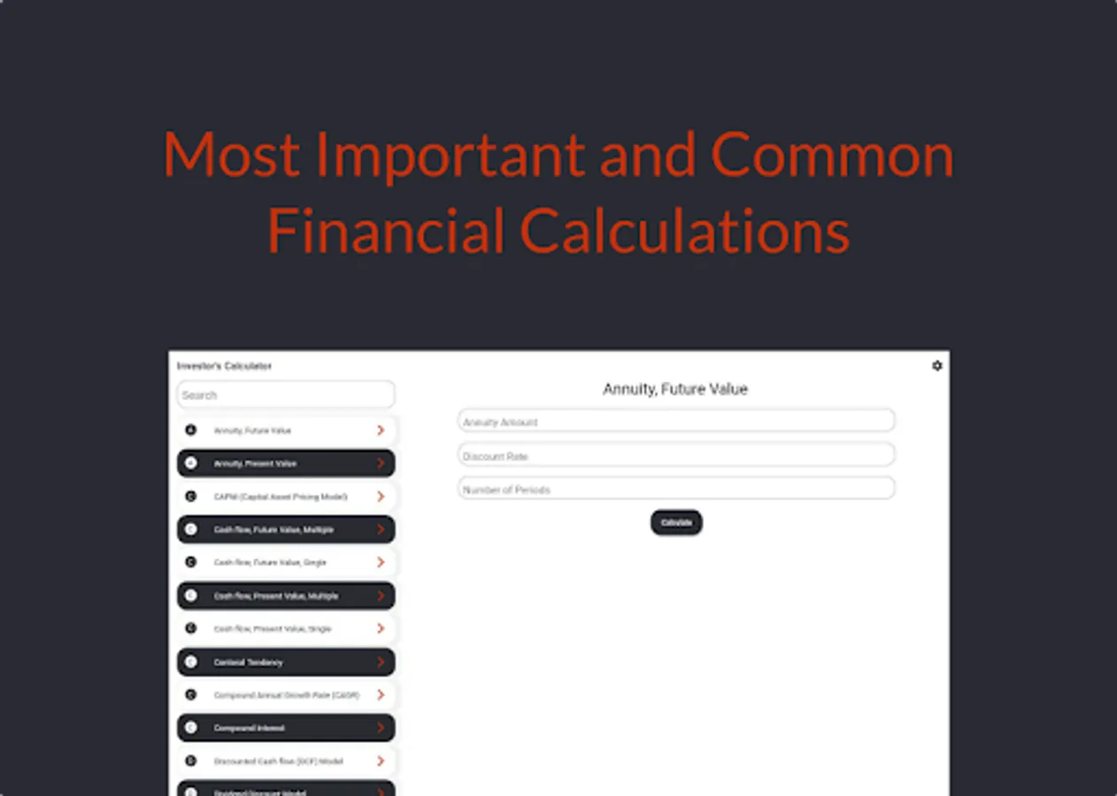Investor's Calculator provides you with the common and useful financial calculations, used in many different investments around the world, with a simple and easy to use interface.
