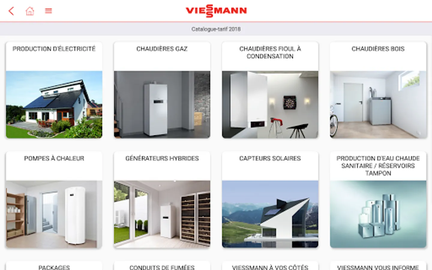 The catalog-price Application reserved for professional provides access to the catalog-rate, domestic boilers for oil, gas and solid fuels from 1.8 to 170 kW hybrid generators from 4 to 15.5 kW water balloons hot up to 1 000 l, solar systems of 1.6 to 3.2 m² and heat pump 3 to 60.1 kW.