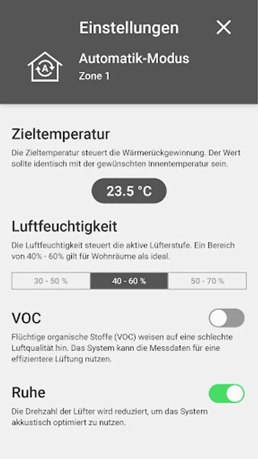 Would you like to decide for yourself when you want to use the heat recovery function for ventilation? Depending on the ventilation mode, there is the option of making further settings. In the "ventilation" mode, the crossed arrows mean "heat recovery", the straight arrows stand for "ventilation", ie ventilation without heat recovery. The direction of the arrow defines the direction of the "ventilation". In the “Automatic” mode, the “Settings” field appears, in which detailed information on the target temperature, humidity and more can be set.