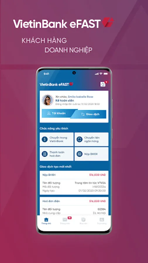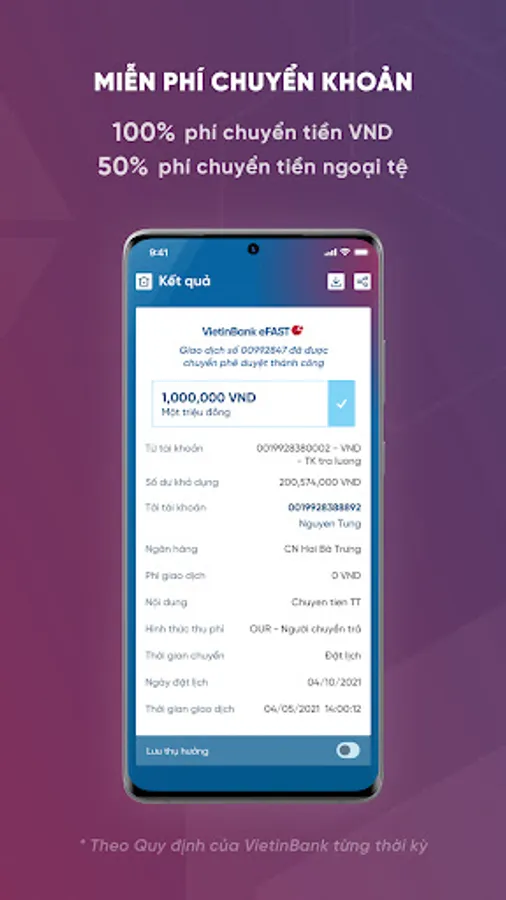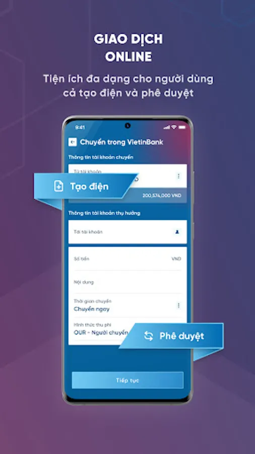 - Transfers (within VietinBank, domestic transfers, outward remittance);