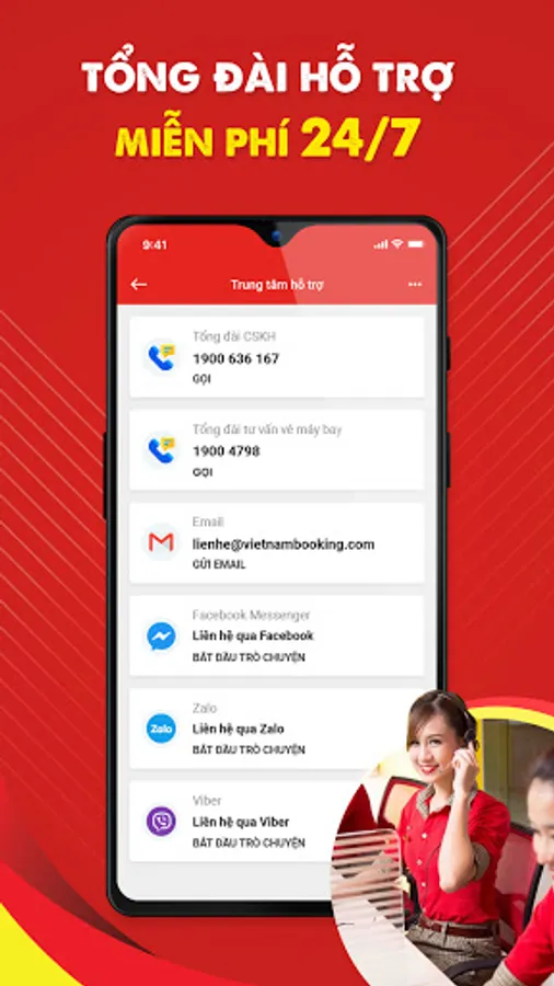 Not only constantly updating attractive promotions from Vietjet Air, consultants from Vietjet Air booking application support customers 24/7 via hotline 1900 4798. Contact the call center for booking. tickets, passengers will be consulted from A to Z about flight schedules, fares and quick ticketing support in just a few seconds.