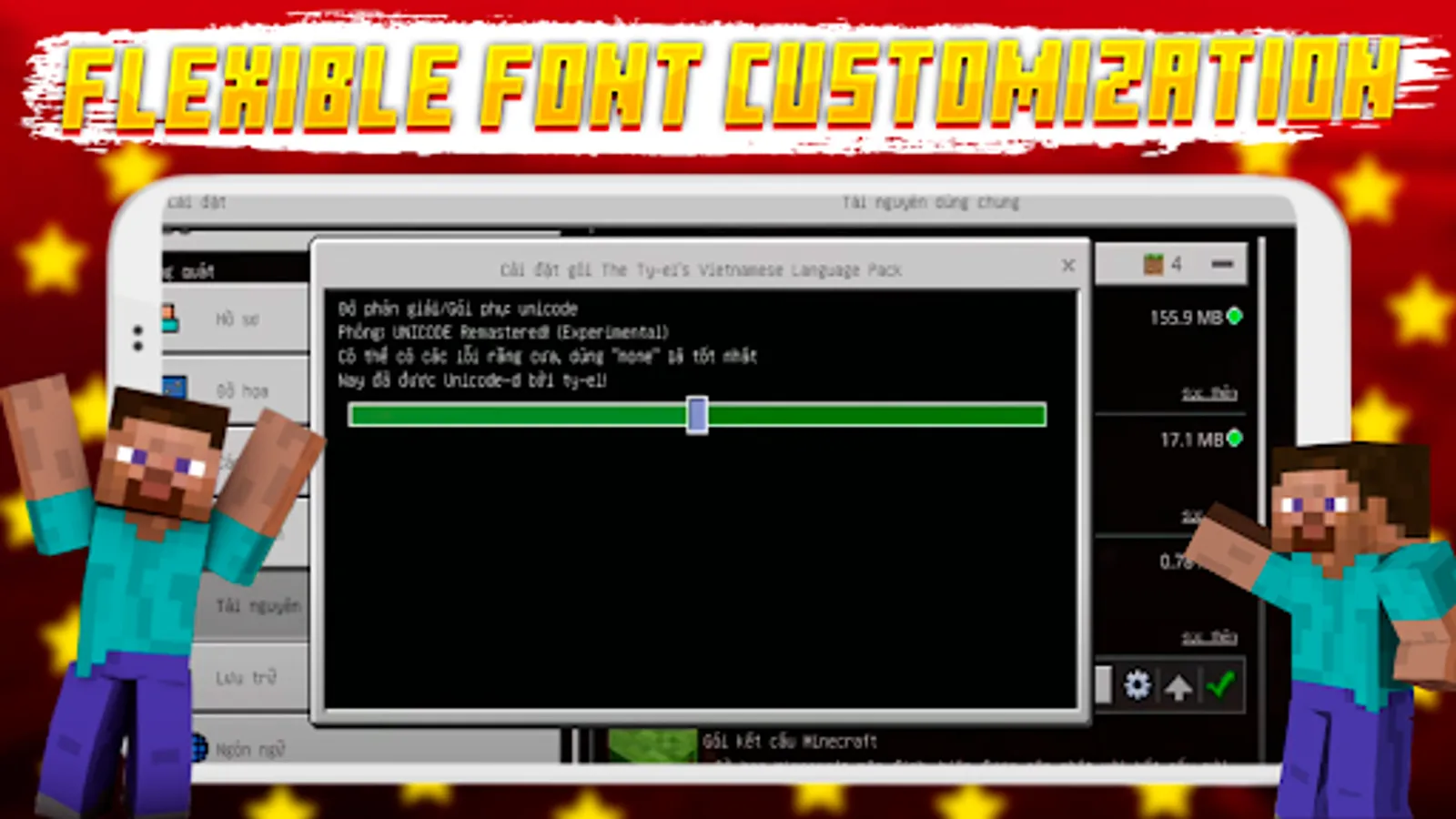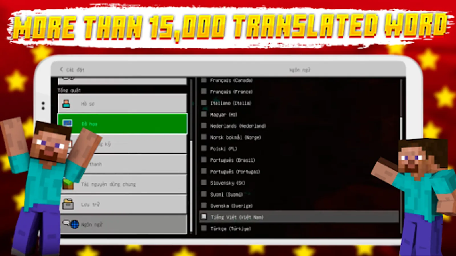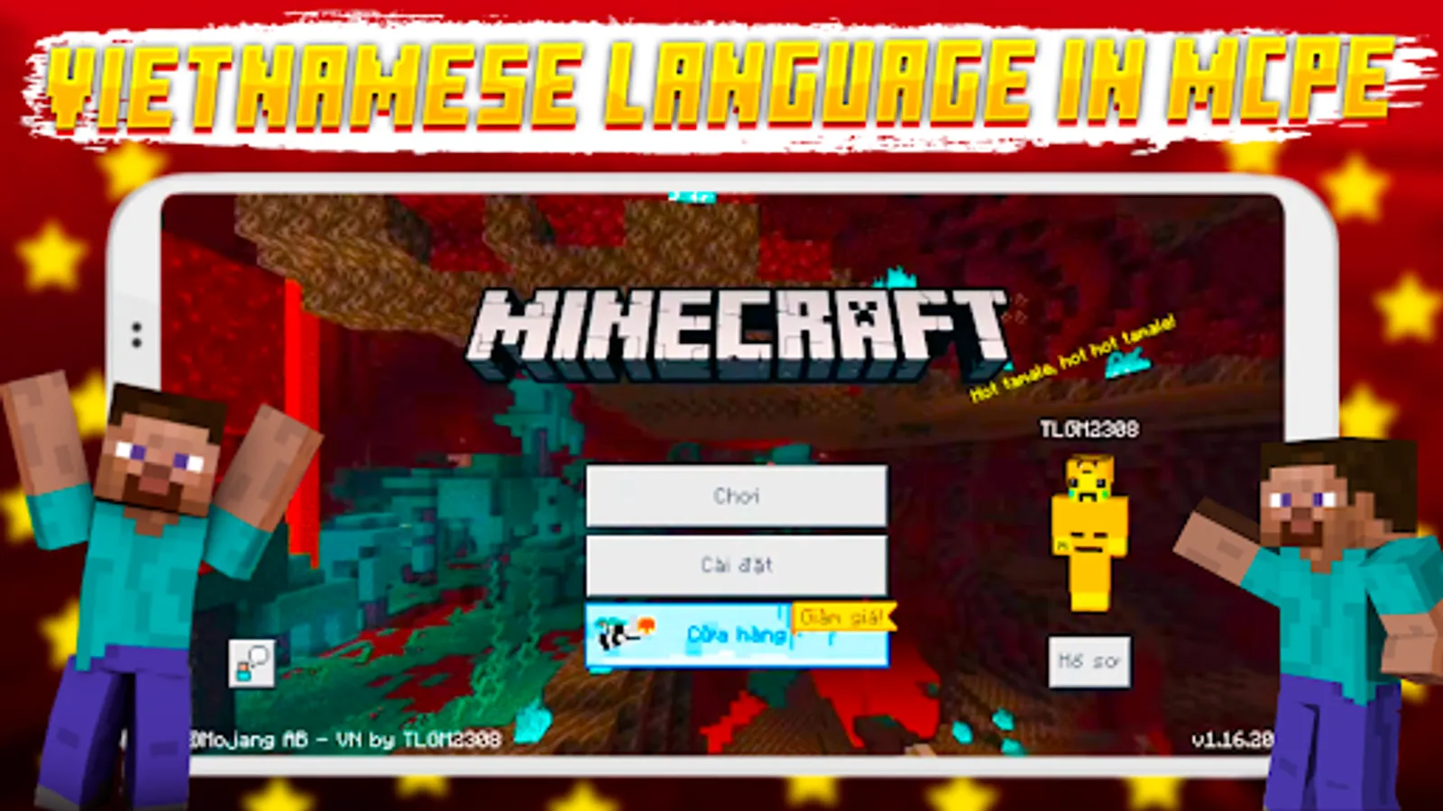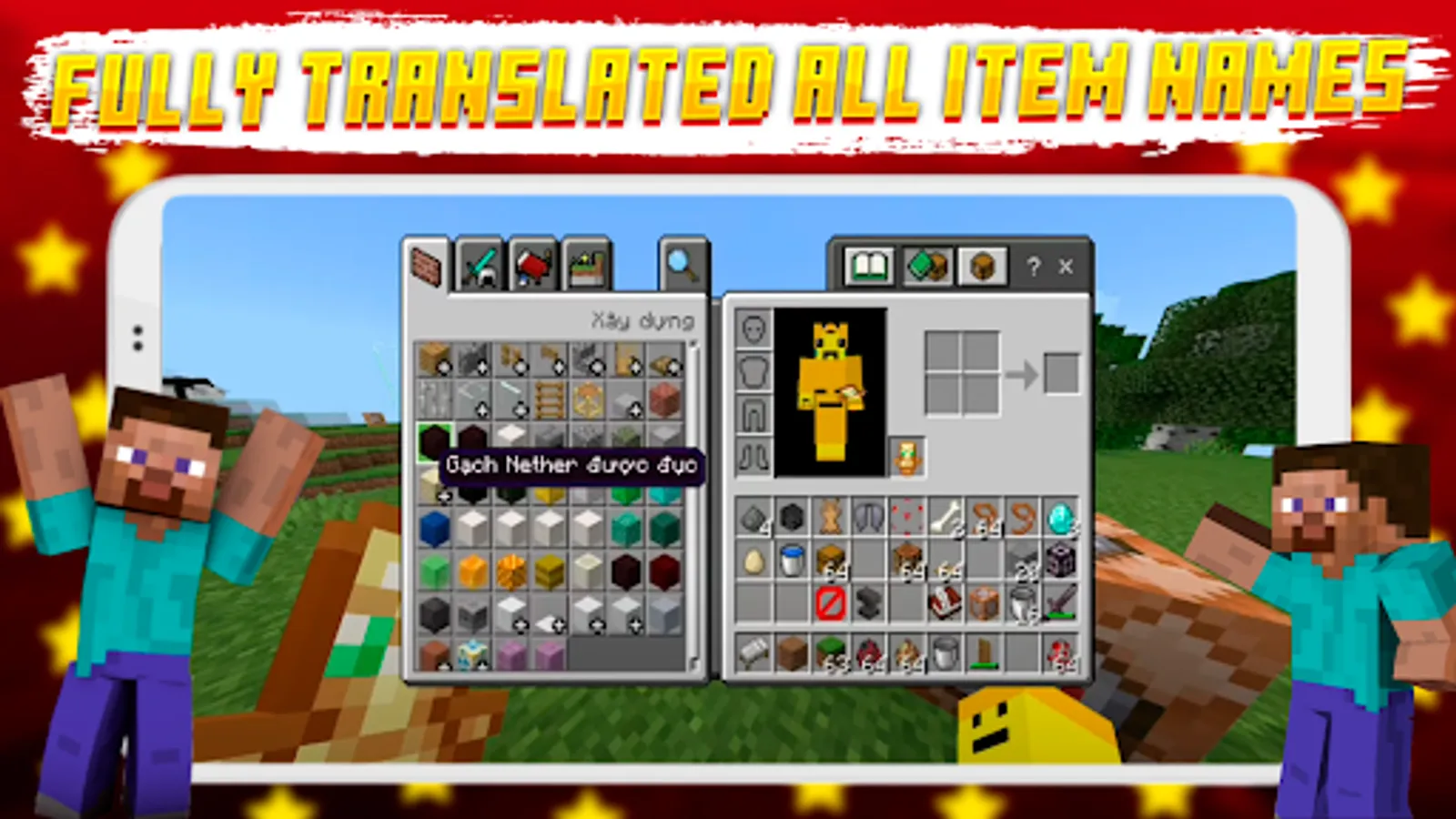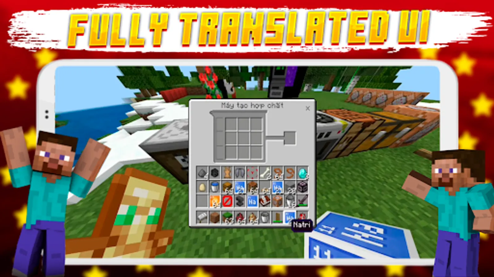 Welcome to the Vietnamese Language mod for Minecraft! If you are Vietnamese and don't understand English, no problem! This mod/addon adds 15000 translated words to Minecraft Pocket Edition and completely translates the whole UI, almost like in java edition, so in one click your MCPE becomes Vietnamese Minecraft and helps you fully immerse yourself in MCPE, thus getting more gaming experience and no longer having to worry about not understanding English in Minecraft Pocket Edition