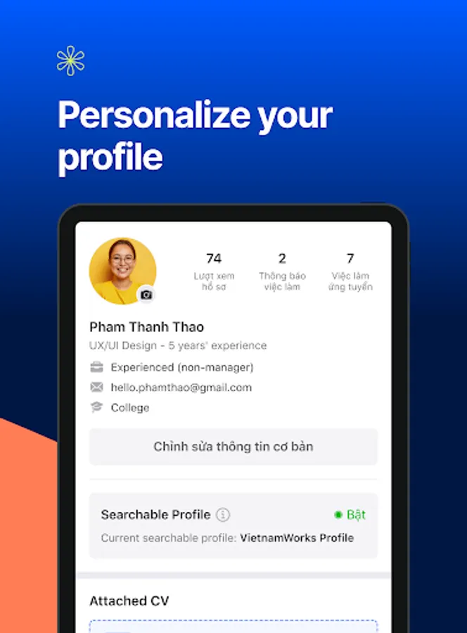 - Easily update or edit your profile, such as: working experiences, skills, education, …