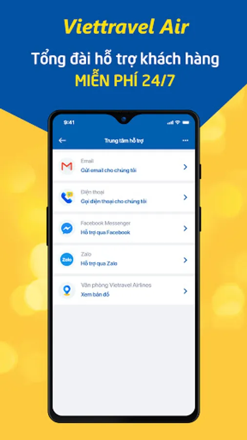 Not only constantly updating attractive promotions from Vietravel Airlines, consultants from Vietravel Airlines flight booking application support customers 24/7 via hotline 1900 4798. Contact the call center for booking. tickets, passengers will be consulted from A to Z about flight schedules, fares and quick ticketing support in just a few seconds.