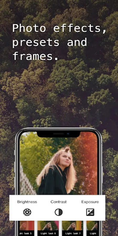 + Photo editing tools including exclusive presets, filters, textures, frames, light leaks and sparks.