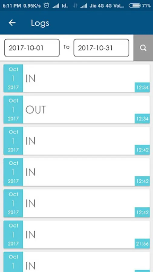 The user can view a log of the IN OUT events created by themselves, or a roll call for the company