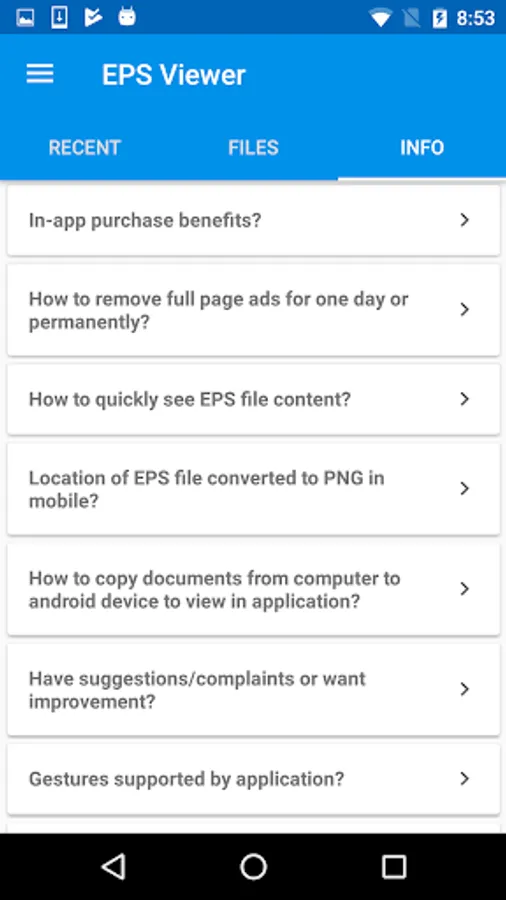 This app previews .eps files created using Adobe illustrator. View Encapsulated Postscript Vector graphics(.eps) file content in your android device without buying costly license.