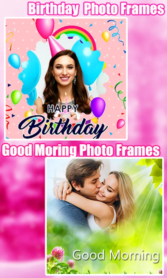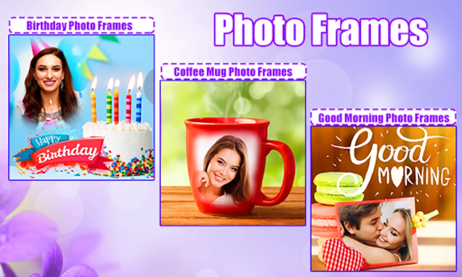 Photo Frames is an all in one application for image sharing and photo editing.The collection of Birthday Photo Frames,Love Photo Frames,Hoarding Photo Frames,Good Morning Photo Frames,Good Night Photo Frames,Coffee Mug Photo Frames,Nature Photo Frames,Good Night Images,Love Images,Birthday greeting images,etc.