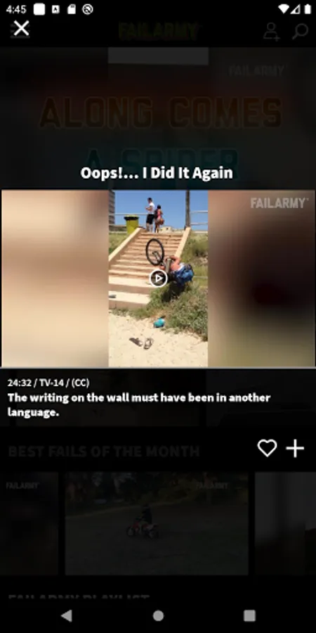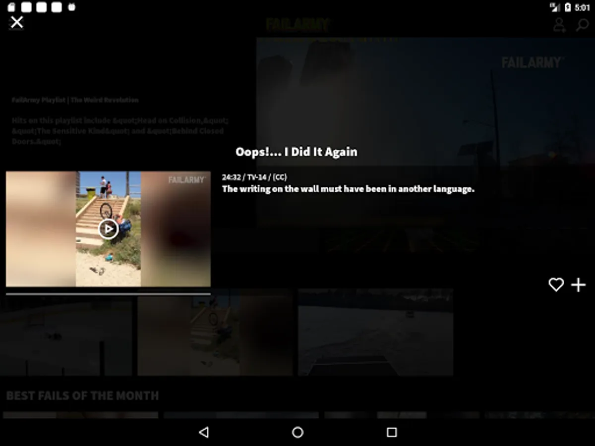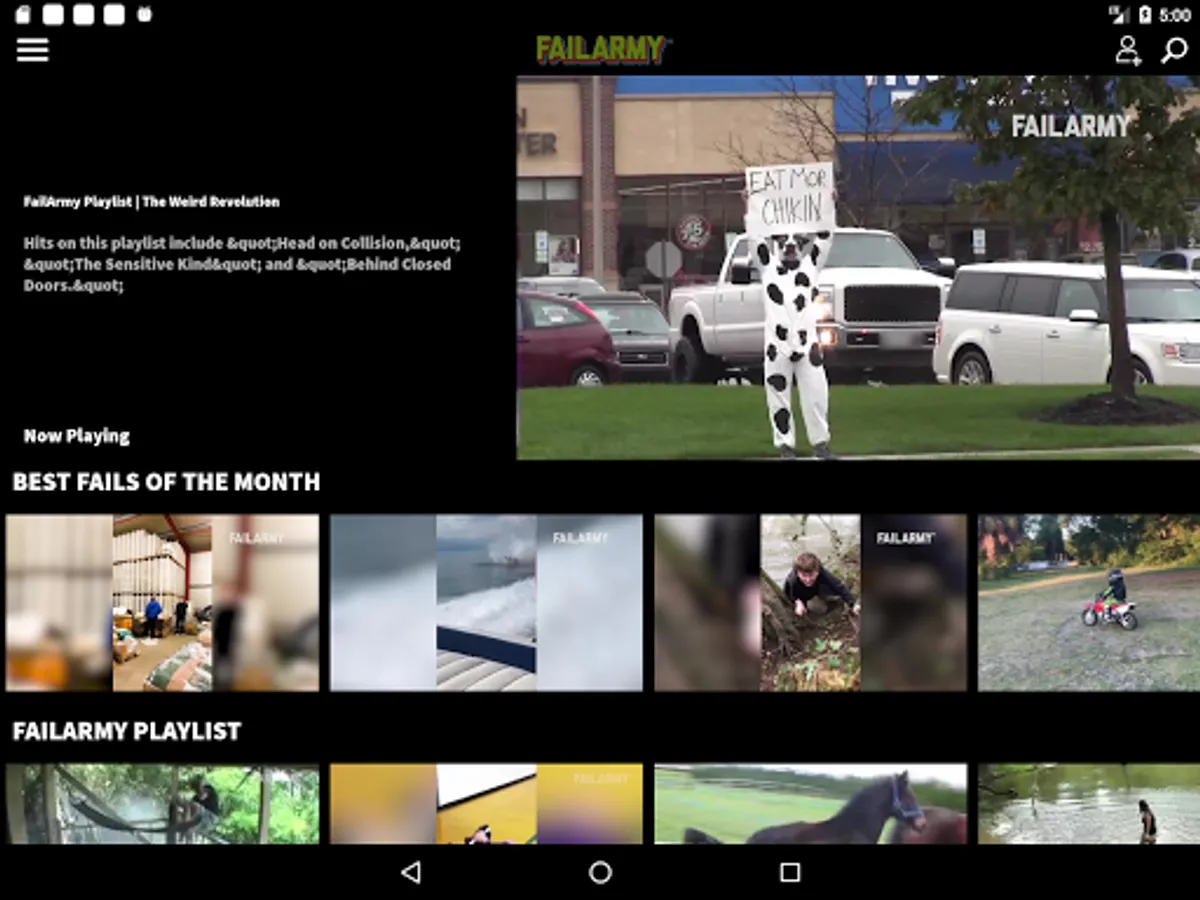 The official Android app of FailArmy, the worldwide leader in funny fail videos & compilations. FailArmy is like your big brother who warns you what not to do but also laughs at you in your most embarrassing moments. From fails and pranks to embarrassing life moments, FailArmy is a comedy brand that celebrates our struggle to get through life - the good, the bad, and the face-plants.