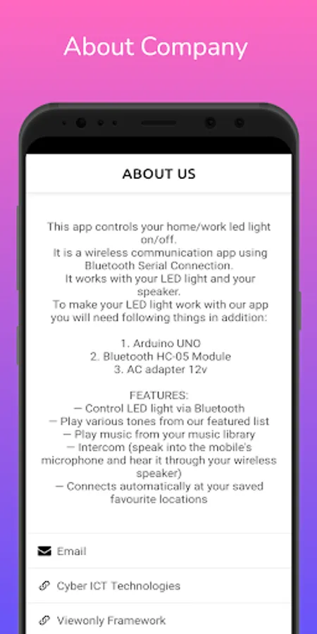 It is a wireless communication app using Bluetooth Serial Connection. It works with your LED light and your speaker.