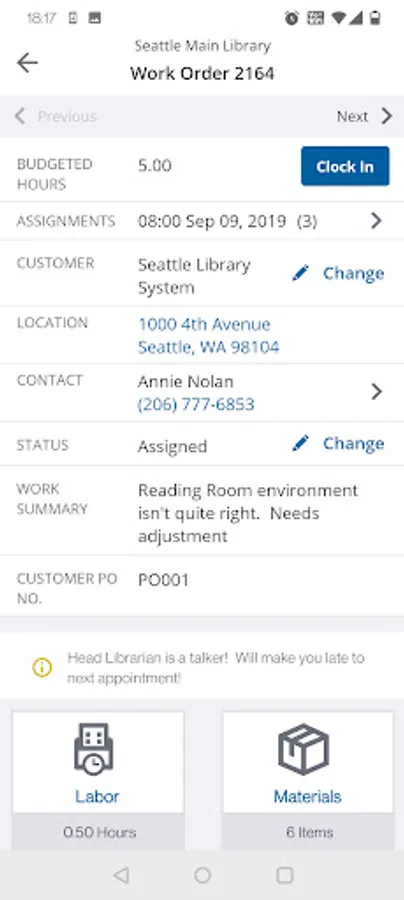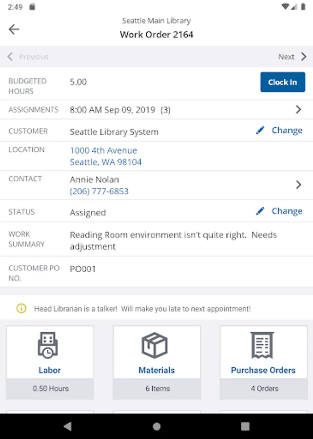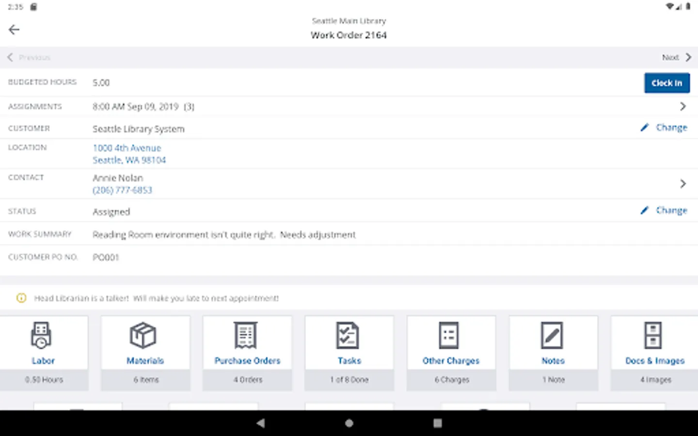 Service Tech Mobile allows technicians to receive work order assignments directly from the office (Spectrum) and then enter time, notes and pictures against the work order. All of the data entered into Service Tech Mobile will be available to the Spectrum Work Order module within moments of connecting to the internet.