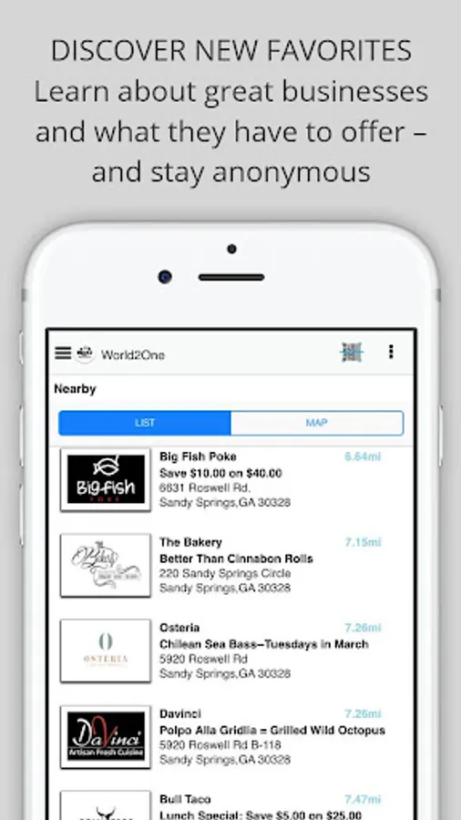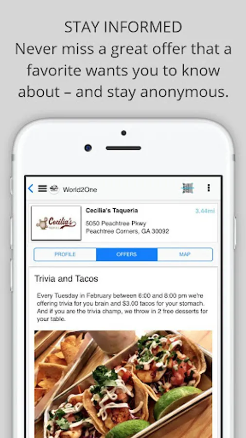 The World2one Android app is the place where you invite your favorite local or national merchants who participate in the World2one ecosystem to communicate with you regularly to make their best offers to you for their products and services—and you remain totally anonymous (you’ll stay anonymous even to World2one as no email address, phone number, address, etc. is required to get started).