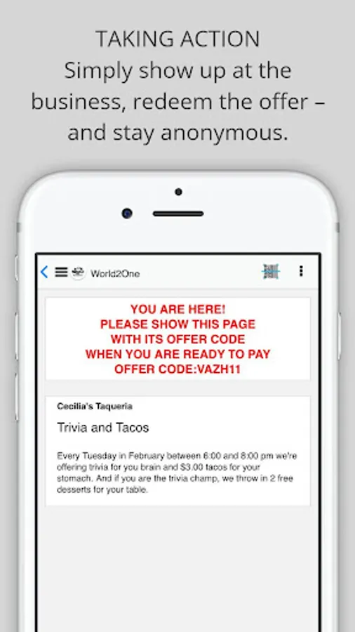 Local merchants are encouraged to vie for your business by creating special offers and discounts that might state a particular day and hour that the discount can be used or the number of customers that can use the offer. Customers are able to use the offers only when they are physically at the merchant’s location, at which time the customer can show the offer to the merchant and receive the discount. For the customer, using the World2one Android app and using a merchant’s offer is TOTALLY FREE—no payment up front, simply pay the merchant for the discounted item you purchased.