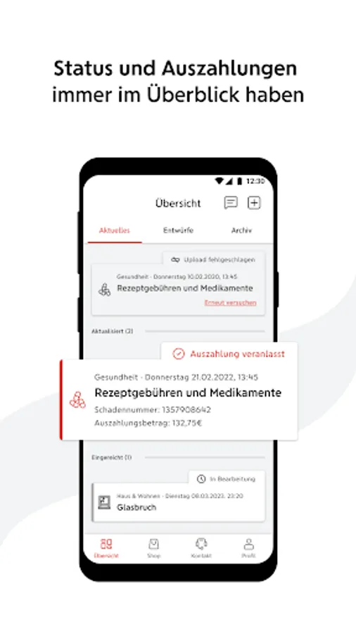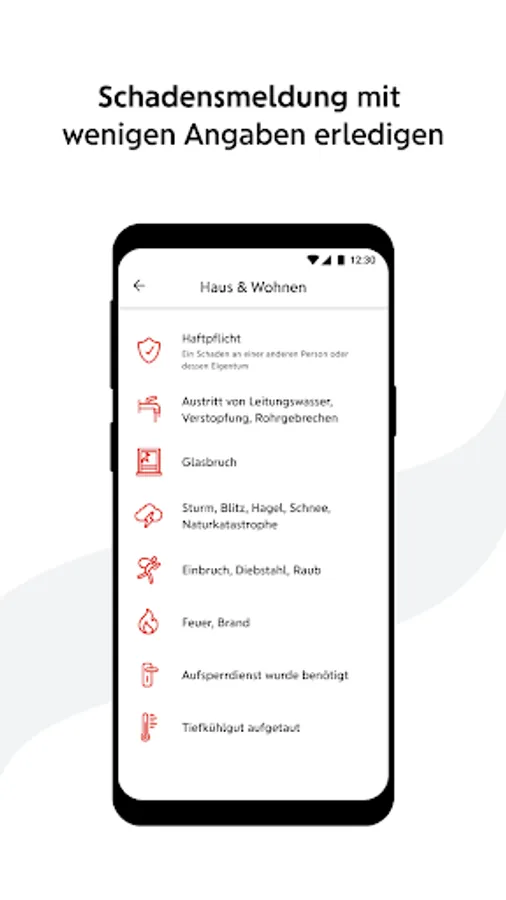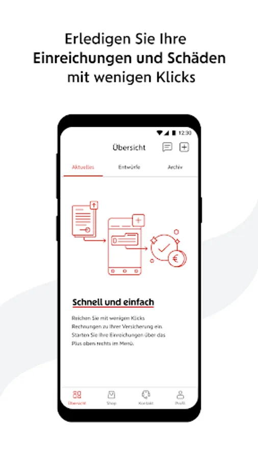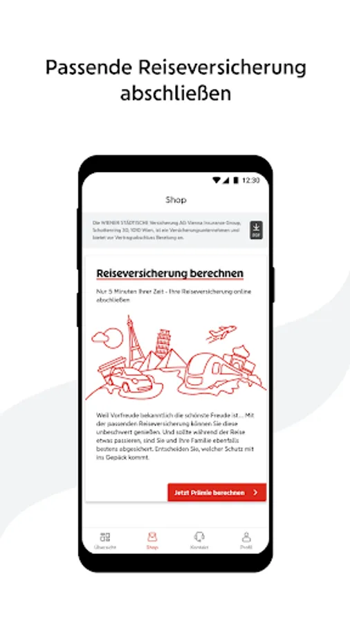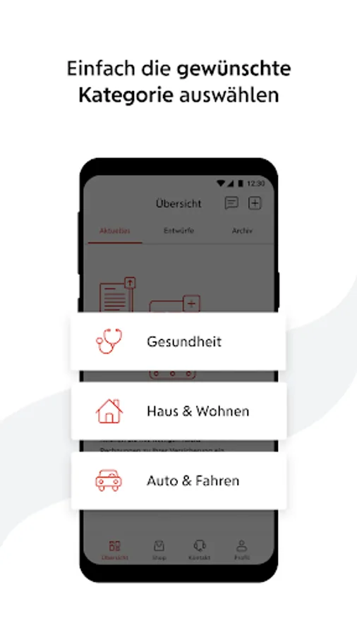• In the shop area you will find the insurance products that can currently be taken out in the app. After a brief determination of your wishes and needs, you will receive a personal product recommendation and the opportunity to take out insurance immediately.