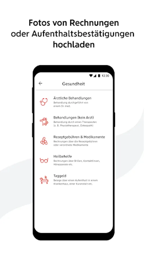 It is particularly quick and easy to submit invoices from doctors, therapists, medication or medical aids, as well as confirmations of your stay in a hospital, spa or rehabilitation facility.