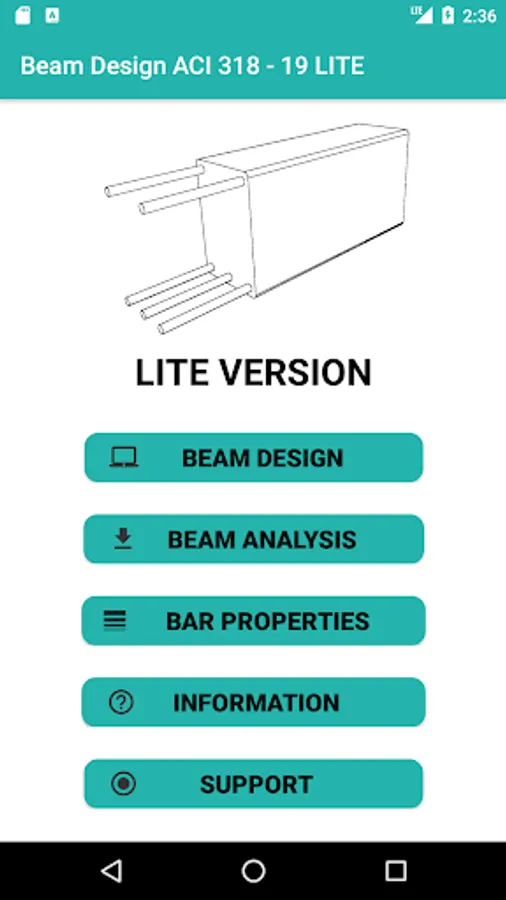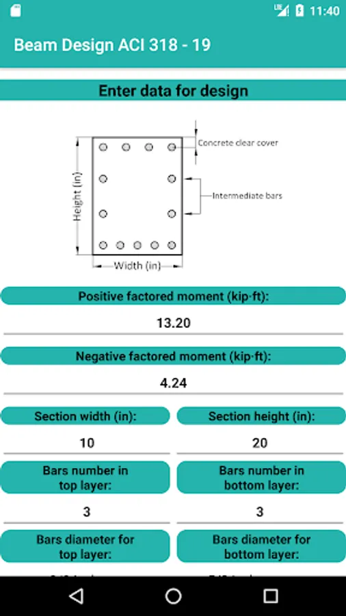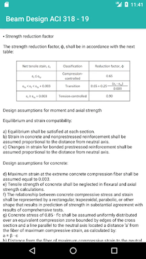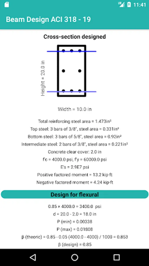 Concrete beam design according to Building Code Requirements for Structural Concrete (ACI 318-19).