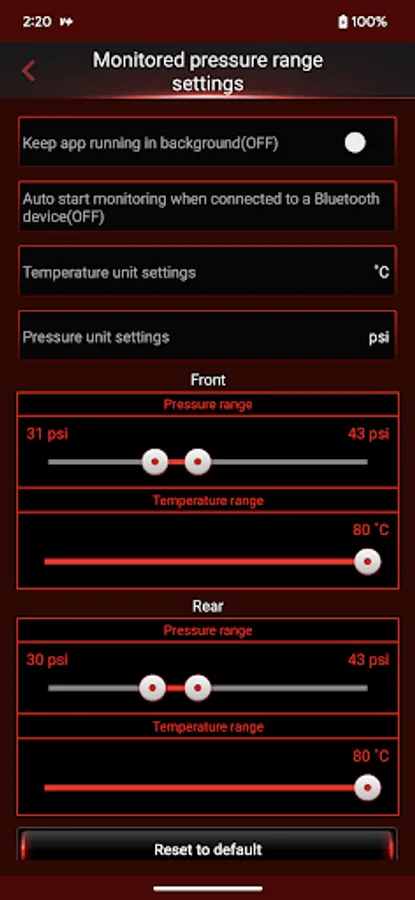 5. Unit Options: Choose from psi, kPa, or Bar for tire pressure units and ℉ or ℃ for temperature units. Configure temperature and pressure limits as needed.