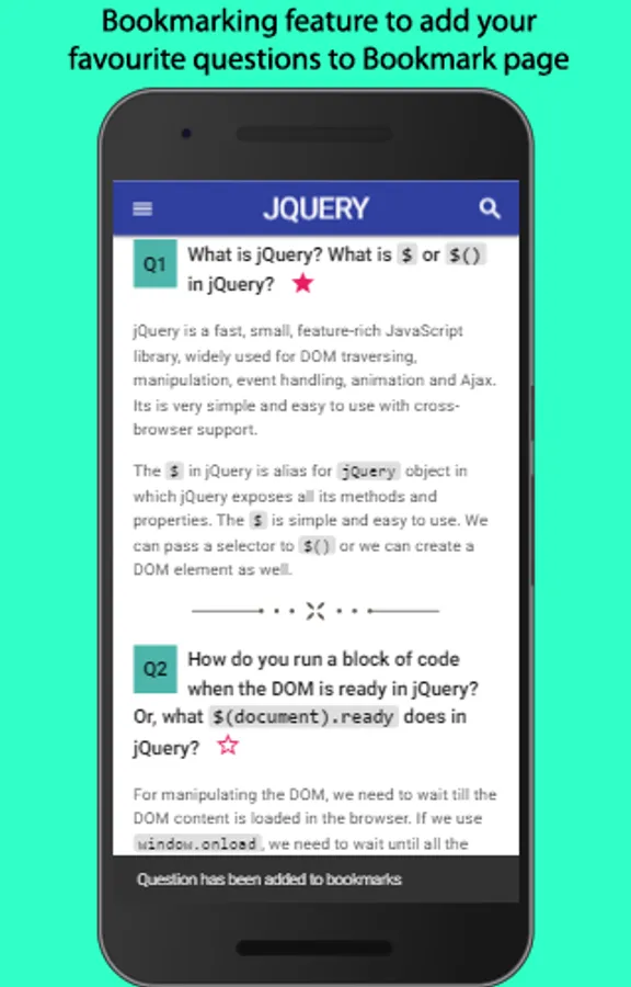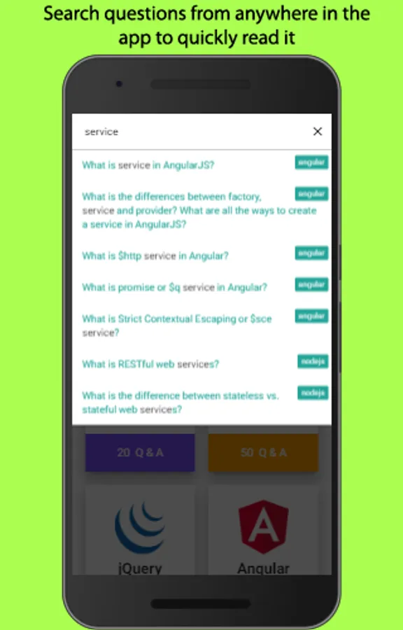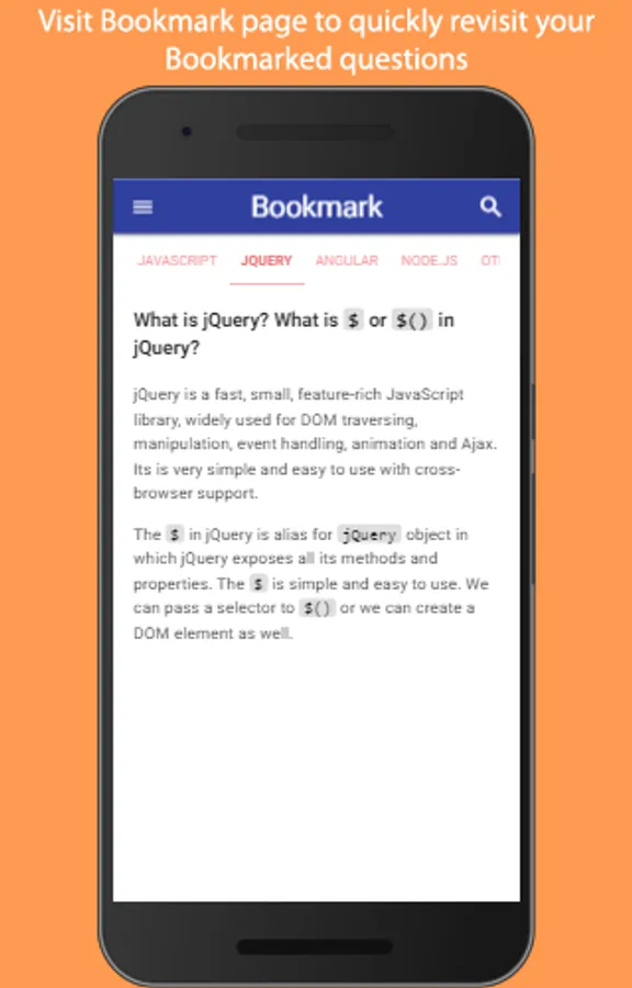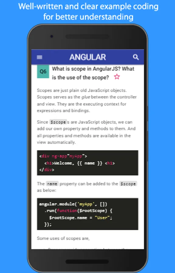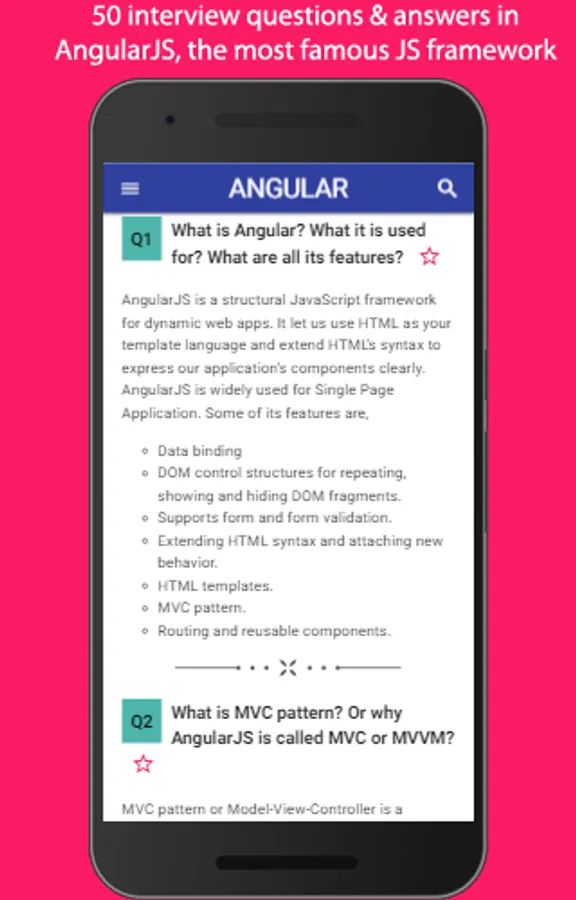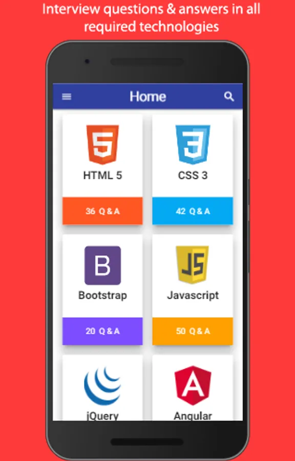 Due to some technical issue unable to update this app further, so please try our New Interview Questions App at https://play.google.com/store/apps/details?id=com.vigowebs.interviewquestions. It contains 600+ questions from most wanted topics such as HTML5, CSS3, Jquery, JavaScript, ES6, Bootstrap, Angular JS, TypeScript, Angular, React JS, Node JS, Mongo DB and Adobe Experience Manager - AEM.
