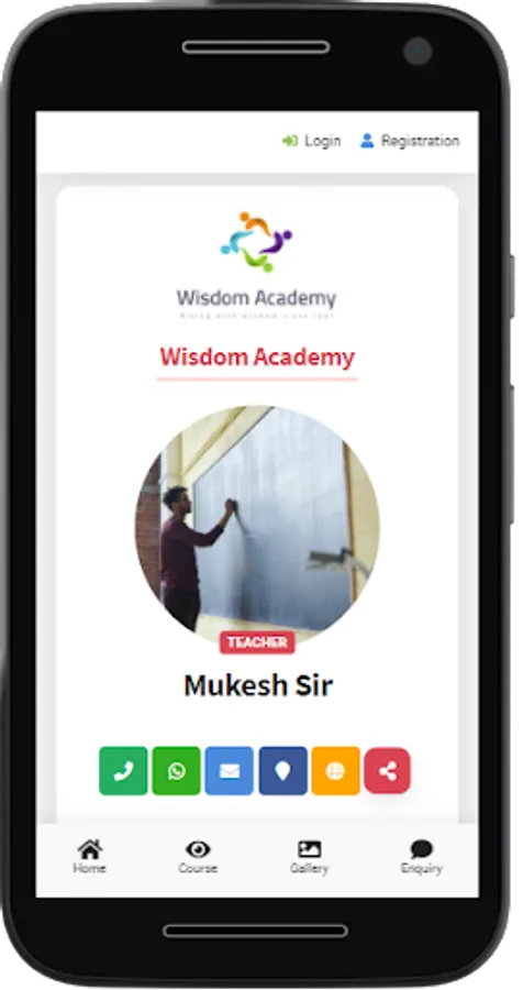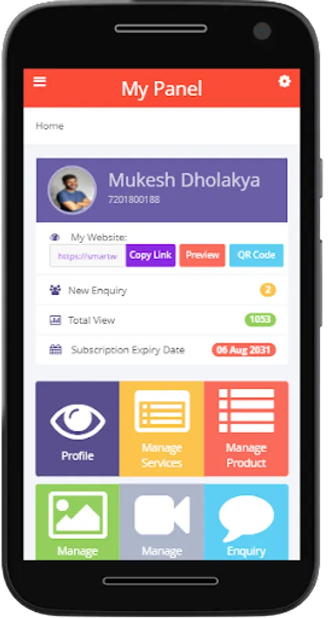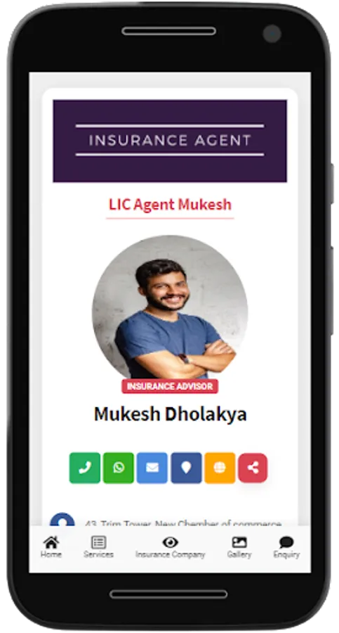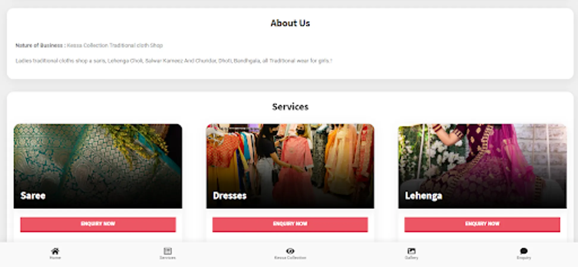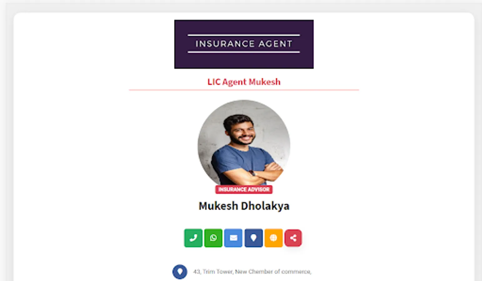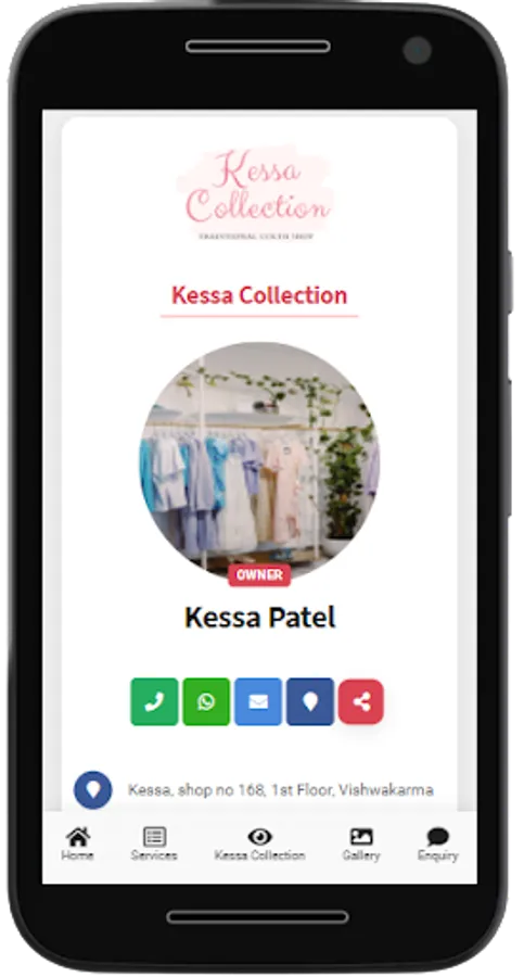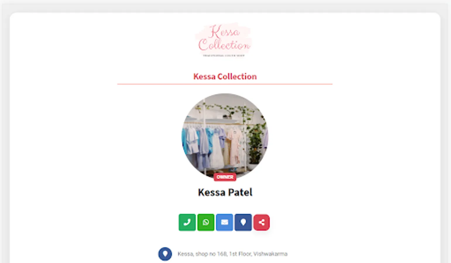 3. Digital card with features as call, WhatsApp chat, address display, location by google map, website link, share card link by WhatsApp, display business details, display services, display product catalog, inquiry section, social media integration