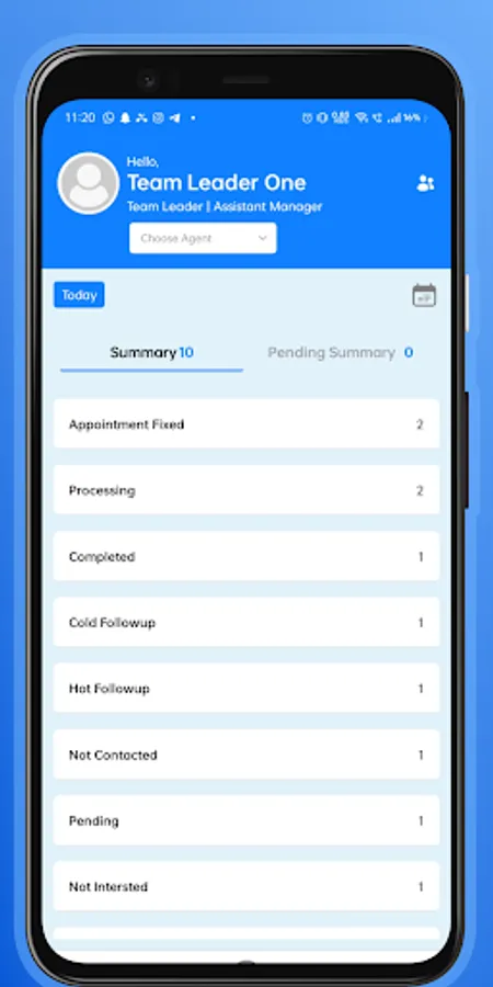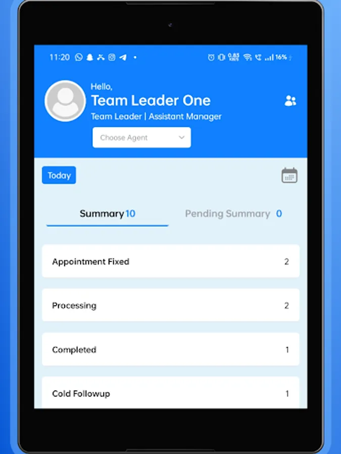 Team leader can manage the team and he can see the summary and pending summary of the assigned tasks. Team leader can able to create task and can assign to any agent or self.Team Leader can see his team productivity.