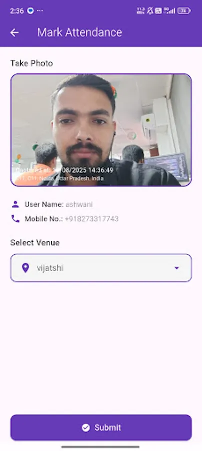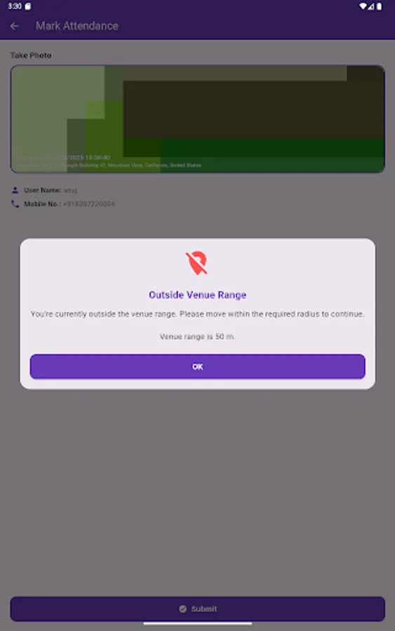 Location-based attendance check-in – Attendance can only be marked when the user is near the assigned location.