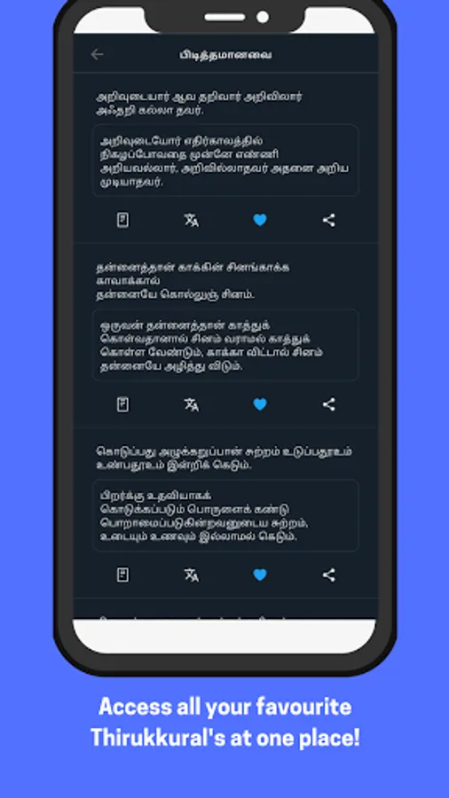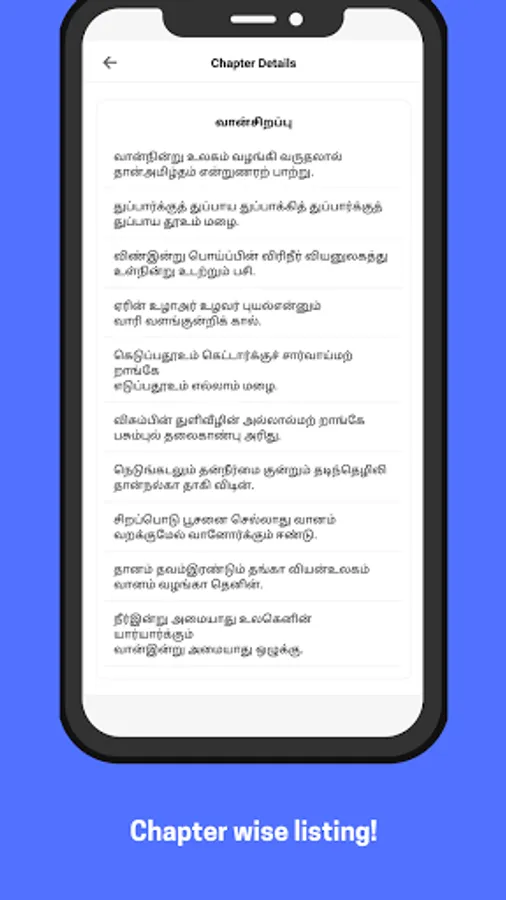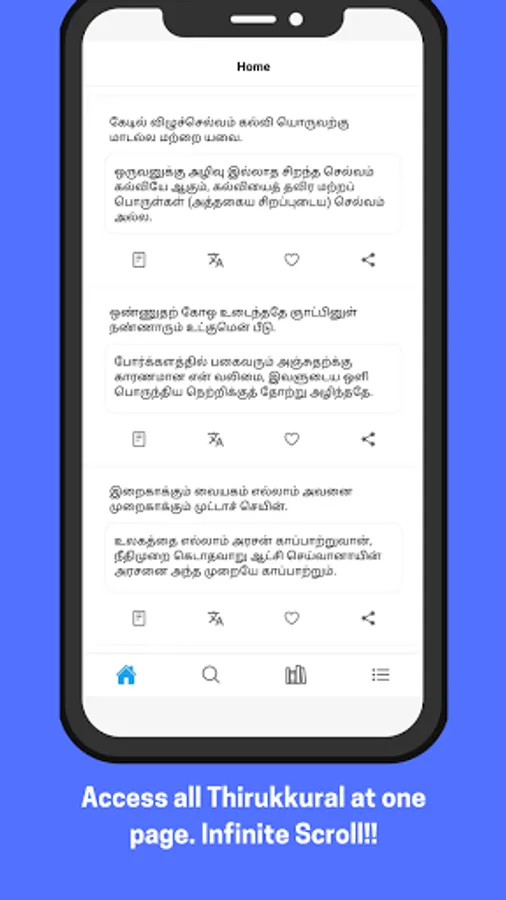 ✔ Refreshing random Thirukkural list every time the app launches meaning that you can read all the Kurals without stepping into the next screen.