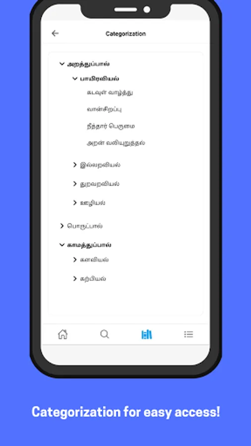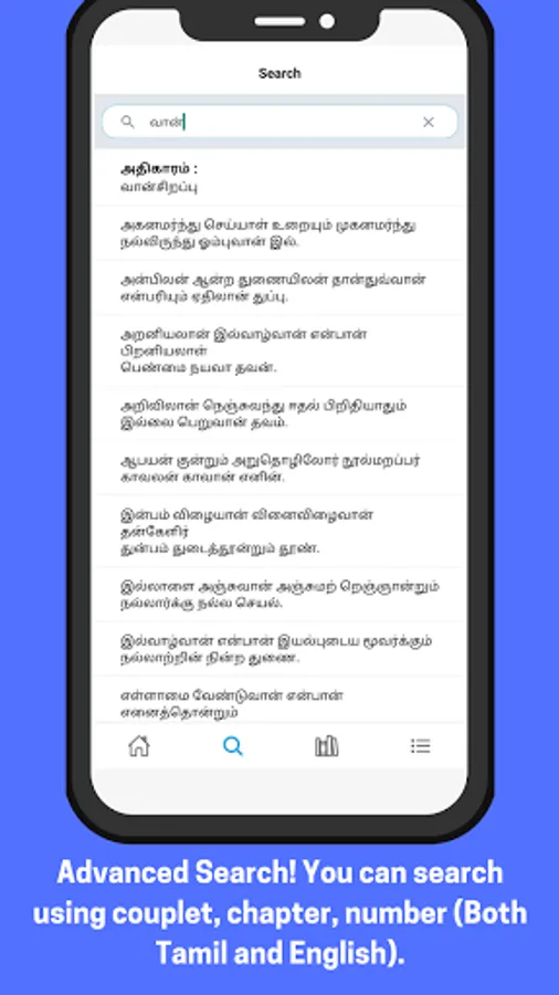 ✔ Advanced search options. Supports English and Tamil characters. You can search by either the Kural (Couplet) or Athigaram (Chapter).