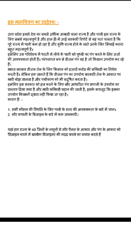 Here what we attempt is to help the rural designer in designing the solar panel size and pump size from samples of 45 districts of state for varying water level for one place from 2 meter below the ground to upto 60 meter approx 200 feet maps for sizing PV panel and pumps ,motors are mapped .