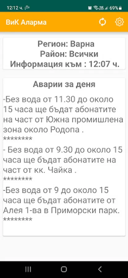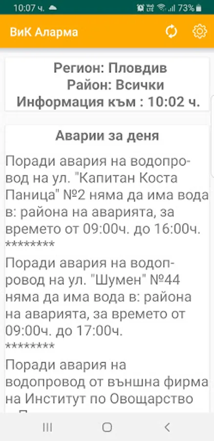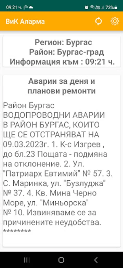 The application currently serves only the subscribers of Varna Waterworks (with Devnya, Provadia and Dolni Chiflik districts), Plovdiv Waterworks (with Plovdiv-city, Karlovo, Asenovgrad, Krichim, Trud, Parvomai, Rakovski, Laki, Rodopi, Saedinenie and Hisar districts) and Waterworks Burgas (with Aytos, Burgas-city, Kameno, Karnobat, Nessebar, Obzor, Pomorie, Primorsko, Sozopol, Sredets, Sungurlare, Tsarevo, Ruen and Malko Tarnovo districts). You will receive a notification of an accident or planned repair a few minutes after its publication on the company's official website. To receive notifications on Android version Tiramisu (Android 13) or later, you need to enable notifications for the app. Unfortunately, the information on the Varna Waterworks website is published late in 90% of cases and in only about 10% in advance. Information is received on average three times every hour, with the user having the option to manually refresh the information, and the limit is once every 3 minutes. You have the option to choose the notification method - only visual with a changing icon in the notification area, and also enable sound and/or vibration. ViK Alarm will not automatically notify you of the time between 8:00 p.m. and 8:00 a.m., in order not to disturb the sleep of its users, in this interval, however, you can manually update the information if you wish. The application is extremely easy to use and set up, while taking up very little space on your device. The author of the application is not responsible for incorrect and untimely information regarding accidents and scheduled repairs. The information in the application is obtained directly from the publicly available websites of the companies, without any intervention. The application collects and uses absolutely no personal data about users and is free to use, contains no ads.