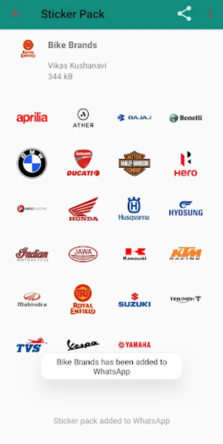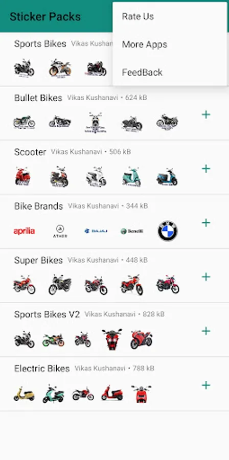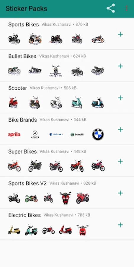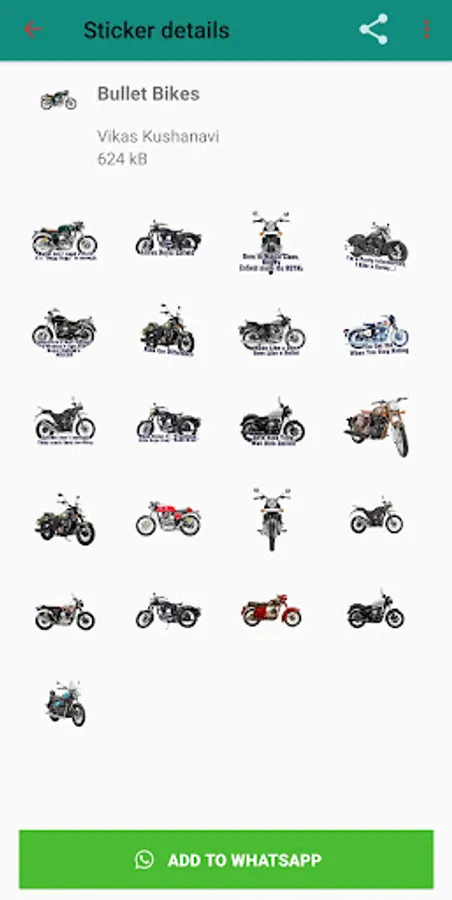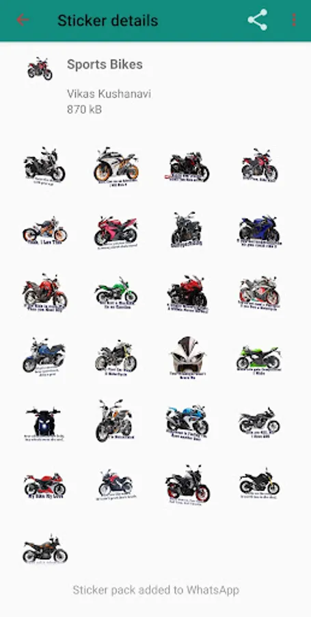 Add stickers packs for whatsapp which include various categories like Sports Bikes, Bullet Bikes, Scooters and Bike Brands. Almost all kind of stickers are added in a single app which also includes a very nice quotes with bikes to make a good chat with friends and bike riders.