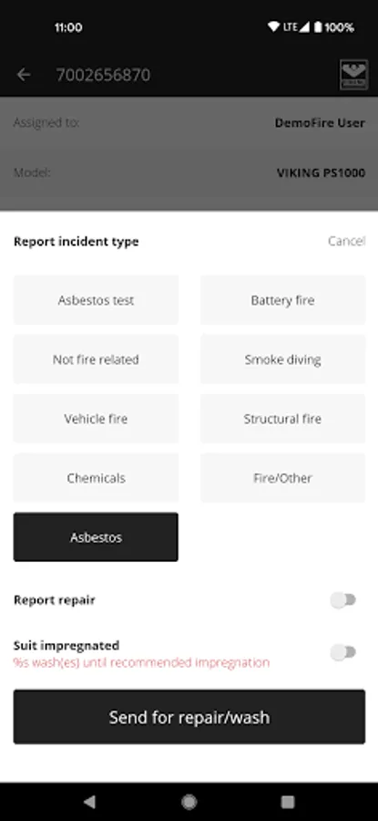 Simply scan the barcode or NFC chip and register information about exposures, washings, maintenance and repair. The overview provided helps improving washing routines and keep track of the need for impregnation.