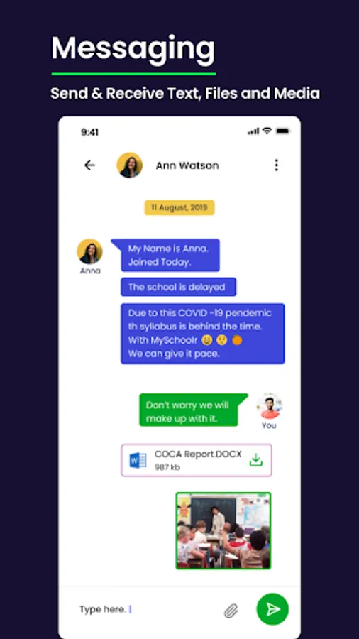 Teachers can now directly communicate with parents & students about Homework and privacy notices in the form of messages, Images, Files, etc. MySchoolr uses your phone's Internet connection (4G/3G/2G/EDGE or Wi-Fi, as available)