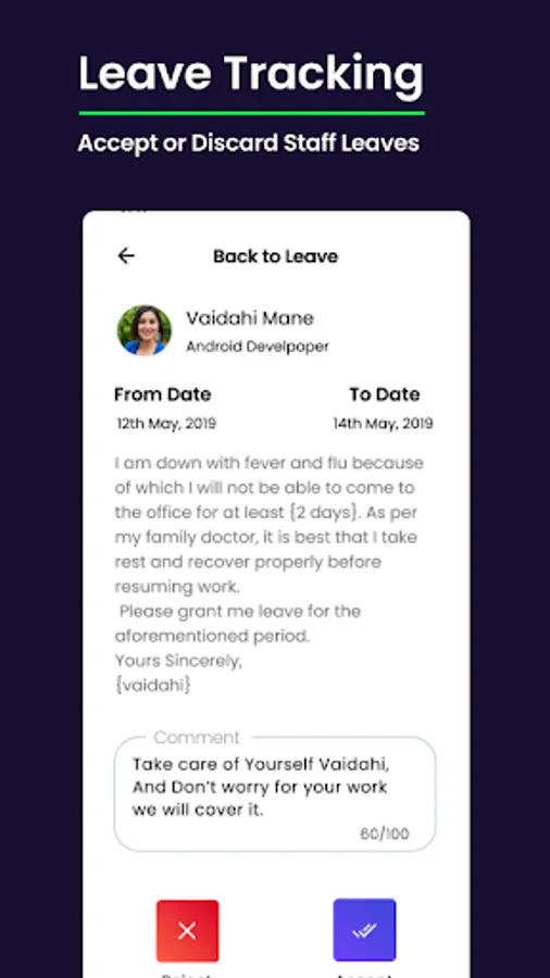 No more lying, no more Excuses. With MySchoolr app students, parents, and your organization staff can send and approve leave application with reason and validate proof.