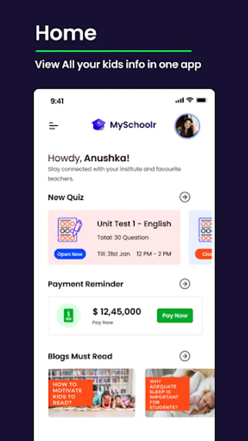 If parents have two or more kids learning in different schools or colleges and if both institutes using MySchoolr, you can get details of both kids in the same app. Switch between multiple profiles without signing out.