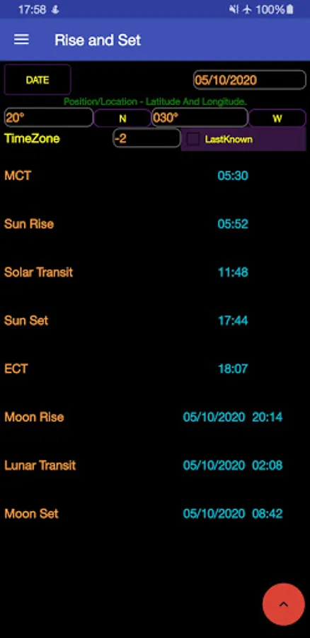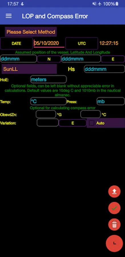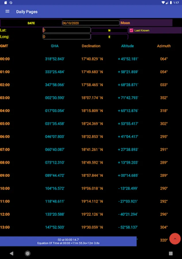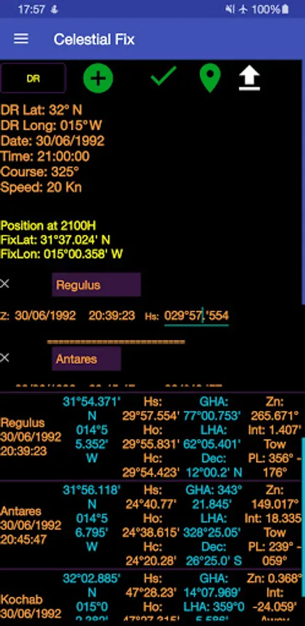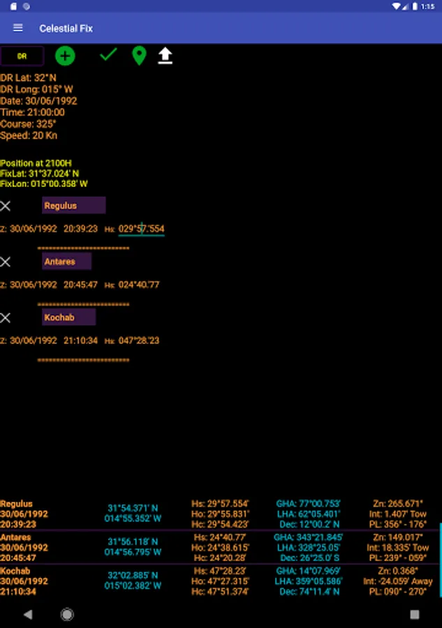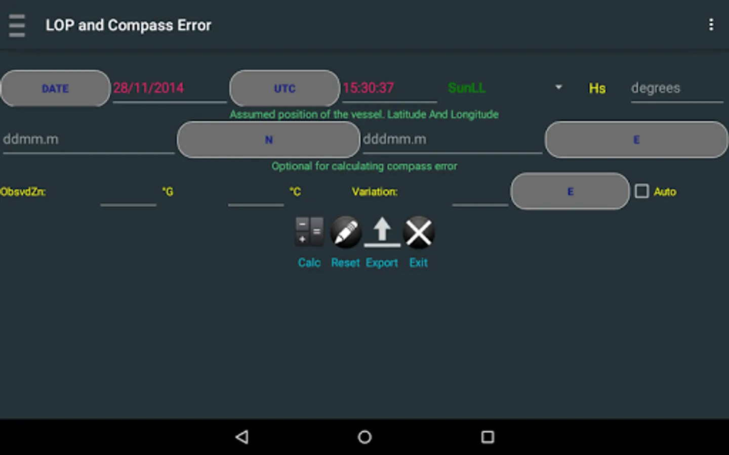 It features a rise set and merpass calculator, a line of position and compass error including gyro calculator , a celestial fix calculator (with auto run up and dead reckoning),an almanac of sun,moon,planets and 58 navigational stars.It supports the three most widely used navigational methods for calculation of lines of position i.e. intercept,long by chronometer and latitude by meridian altitude.