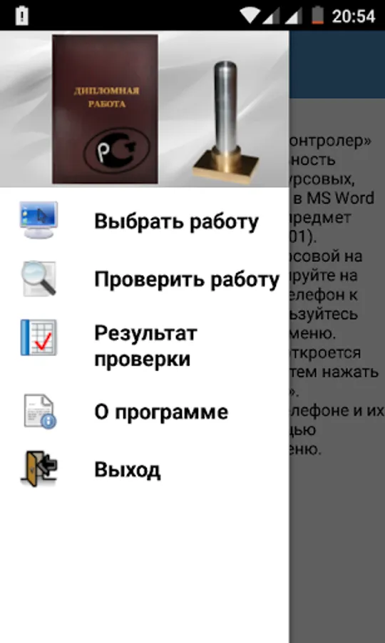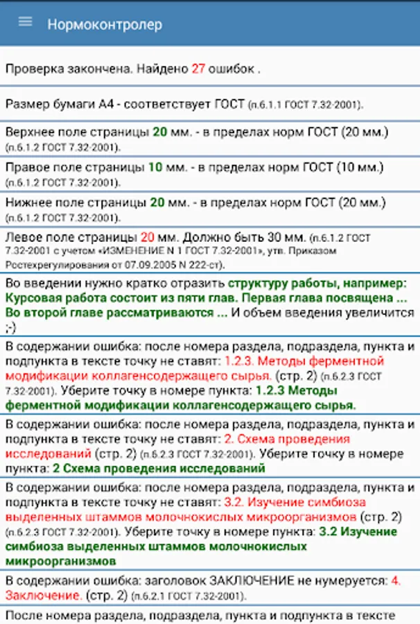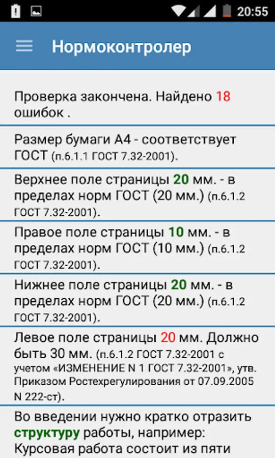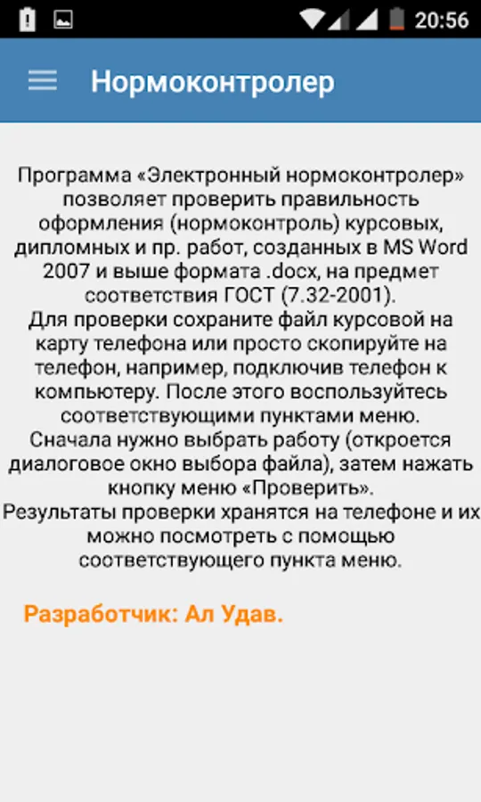 The program "Electronic Normative Controller" allows you to check the correctness of registration (normative control) of term papers, theses and other works created in MS Word 2007 and higher in .docx format, for compliance with GOST (7.32-2017). To check, save the course file to your phone card or simply copy it to your phone, for example, by connecting your phone to your computer. After that, use the appropriate menu items. First you need to select a job (a file selection dialog box will open), then click the "Check" menu button.