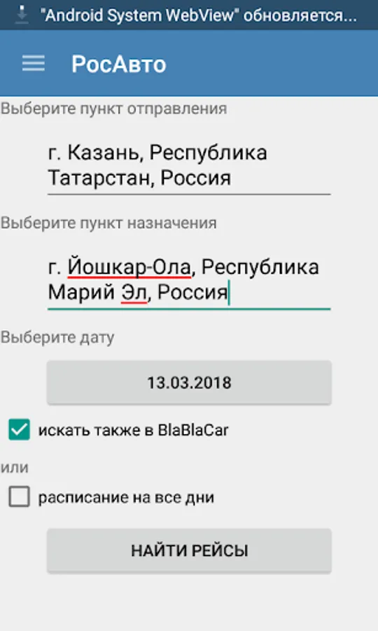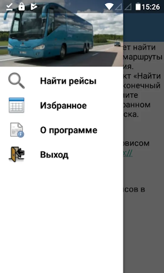The app allows you to find bus routes passenger traffic and a ride in the Russian Federation. From the main menu, select "Find Flights", specify the starting and ending points of the route and press the corresponding button. The favorites are stored search results.