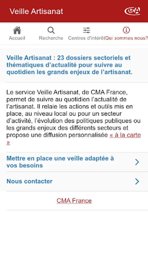 The "Crafts Watch" application is aimed at elected officials or officials of administrations and support networks (Chambers of Trades and Crafts - CMA, professional organizations, etc.), ministerial offices, central administration (Direccte, etc.) , business leaders and their employees and anyone interested in the news of crafts and the local economy.