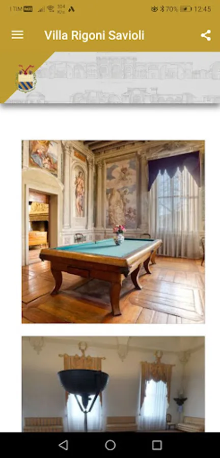 The great ballroom, which once occupied both floors of the central part of the house, was divided after the French Revolution leaving the upper half intact, while the lower half was divided into five portions. The villa is surrounded by a garden and three orchards. It is equipped with various barns and a dovecote or “colombara” tower.