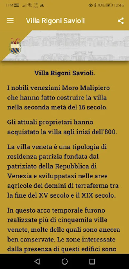 The facade of the luxury villa Italia is made up of four Ionic semi-columns supporting a large pediment; the staircase, flanked by two white stone statues of costozza, like those found on the three doors, leads to the main room of the noble floor or "noble floor". On the ground floor there is a splendid cellar with barrel vaults.