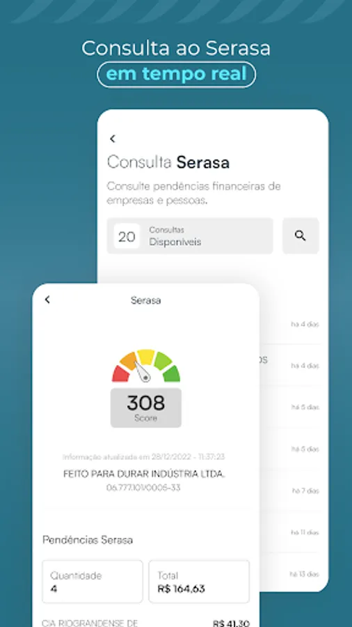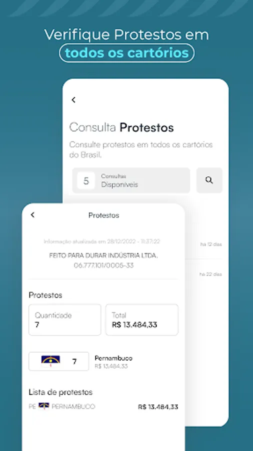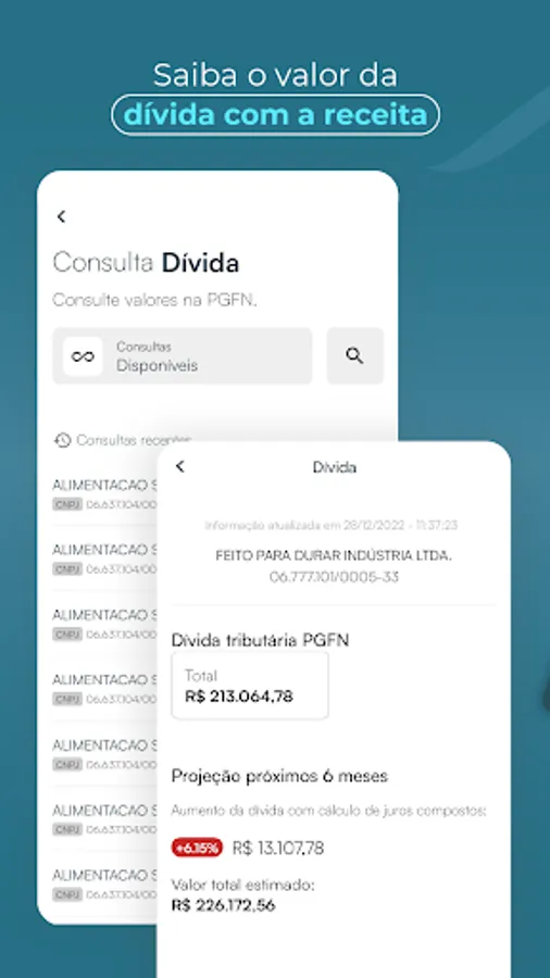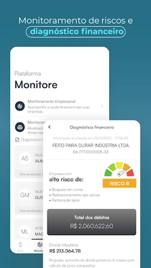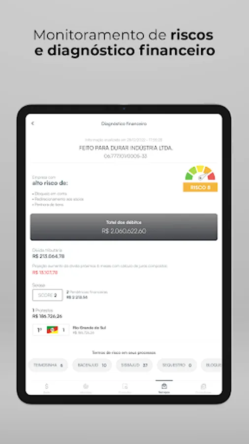 Monitored Account - allows you to monitor debts with the National Treasury, Protest Notary Offices, restrictions on credit protection bodies and lawsuits and procedural movements. It also carries out an instant diagnosis of the company's financial health.