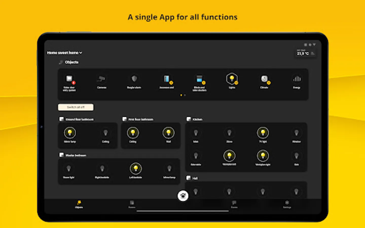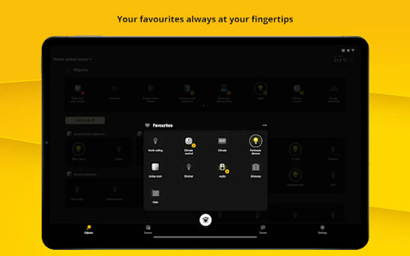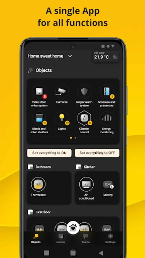 The interface is organised to allow user-friendly browsing by function (“Objects”) or by environment (“Rooms”): popular icons used in the main operating systems, customisable labels and swipe gesture controls help to make the Vimar home automation system extremely user-friendly.