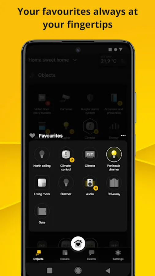 Using the VIEW APP, you can freely create scenarios, customise a favourites page for direct access to the most frequent functions, customise climate control and sprinkler system programmes with maximum flexibility, manage users and permissions associated with the system, add control of Philips Hue system light bulbs and LED strips, and select the push notifications that you want to receive.