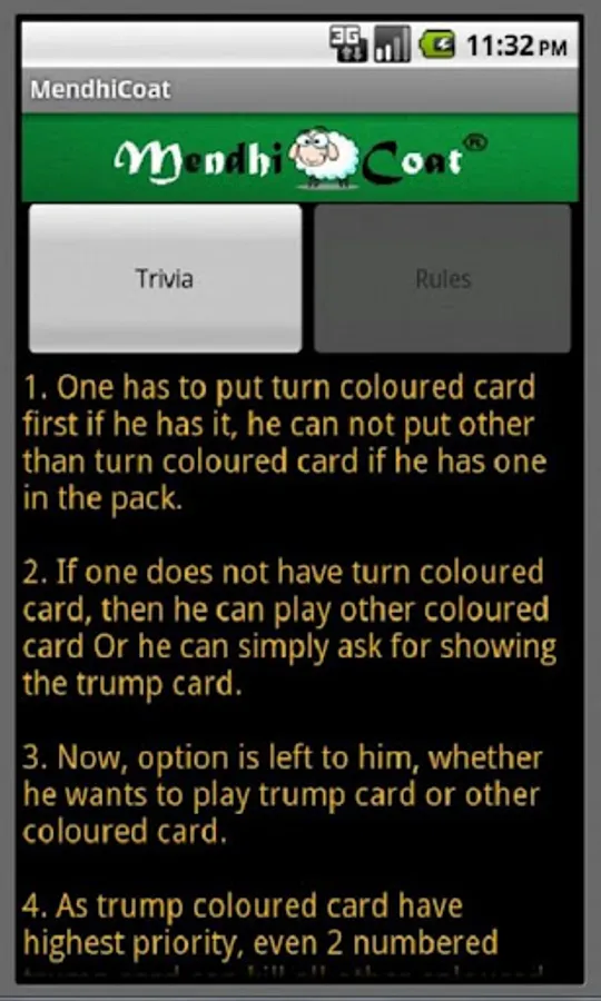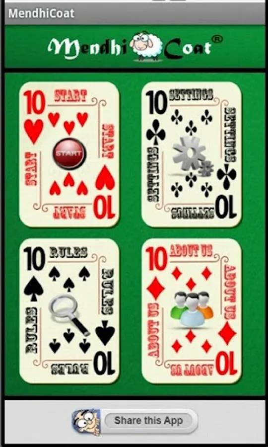 Mendhi Coat is a mind blowing Indian card game. Its all about winning maximum no. of 10 numbered cards for your team and complete as many Coats against the opponents.This version includes features like single player option, customized theme, fonts and buttons. Next advanced version of the game will have Multi player option over the internet, customized team size and much more.If you have played card games like Poker, Uno, Rummy, Solitaire, FreeCell you will like this game too. Hope you'll have fun playing it..!