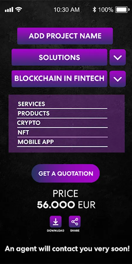 VIN BLOCKCHAIN DEVELOPMENT APP WILL HELP YOU TO GET YOUR INSTANT APROX QUOTATION. Don't delay your projects. In our app you can obtain an approximate price of the cost of your project. You can download a document in pdf explaining the developments in detail. In addition, an agent will contact you immediately
