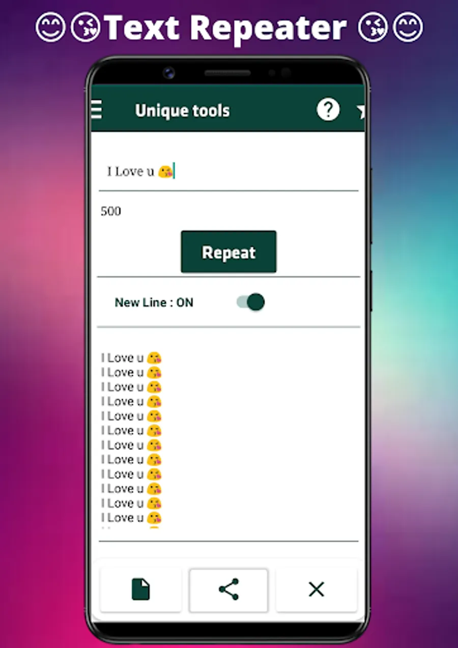 🔰Text Repeater: This feature help your time in typing just with one click you can get 1 message repeated hundreds or thousands of times, You can also use this feature to make fun with your friends and family, or you can convince them by repeating the Text they'll think you have written it hundreds of times and get convinced or kidding friends. Unique tools best feature known as Text Repeater can help you out with this.