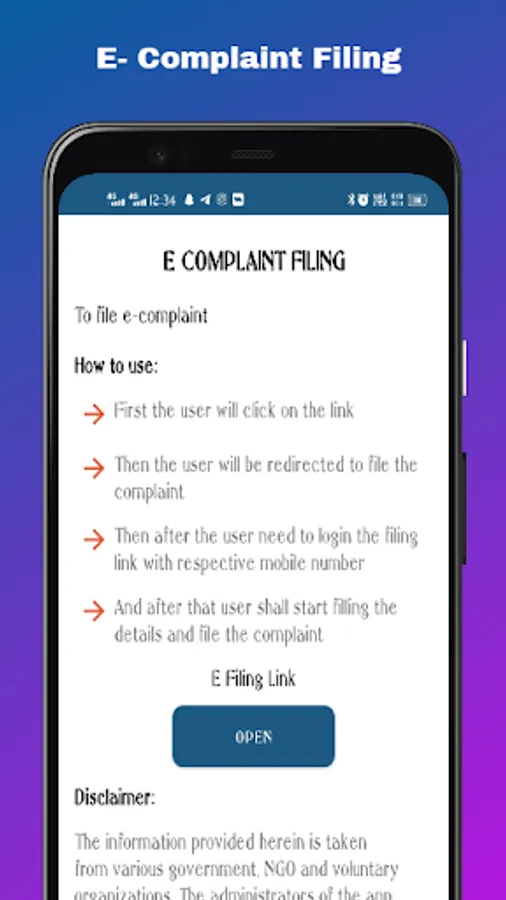 Through this application, the users can file a cyber complaint through the E-Filing link which is provided with the disclaimers in the application.