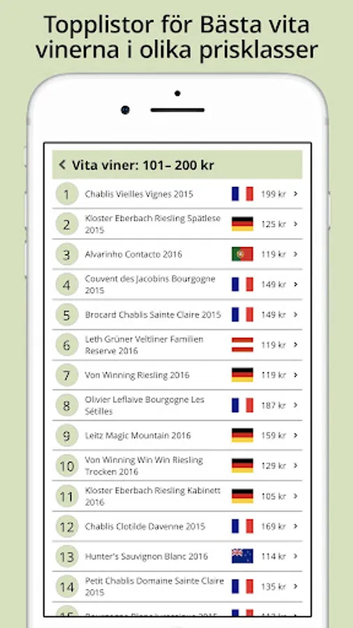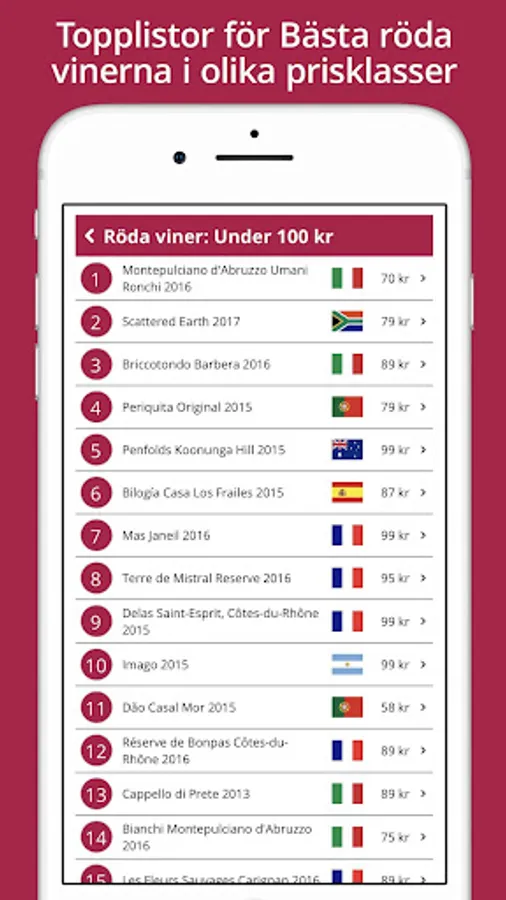 • With the search function, you can also see lists of wines from both the Old and New Wine Worlds: Wines that we can recommend from the large, classic wine countries such as France, Italy and Spain. You will also see ranked wines from newer wine countries such as Australia, Chile, South Africa and the USA. The app covers all wine countries.