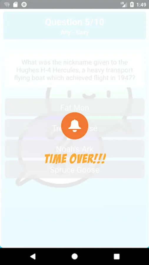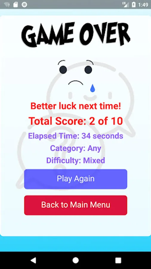 - When all questions are answered it shows the game over screen with total score and elapsed time